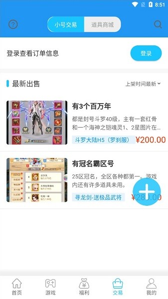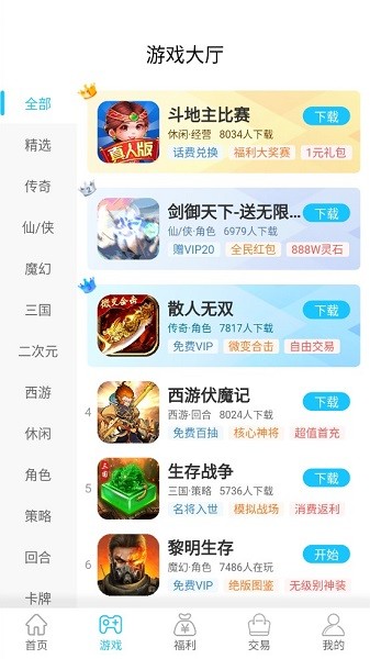 -- 有各种的游戏实时榜单,提供代金券、省钱卡、小号回收等功能交易