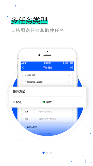 1、多任务类型,支持配送任务和取件任务,让用户都可以更好完成;