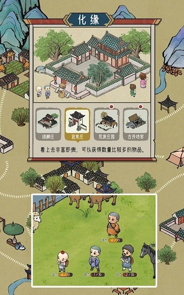 2.开启化缘:下山化缘,便有机会获得丰富的道具和相关事件,从而更好的建设寺庙。
