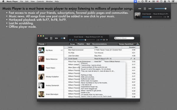 Music Player for mac是mac平台中的一款音乐播放器,这款mac音乐播放软件界面清新,并且还能边听音乐边看新闻或者杂志,同时也提供音乐的缓存记录和离线播放让你想听就听,非常人性化的设计。