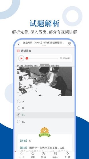 专为国际交流英语考试(TOEIC)精心准备的考试配套题库,每一道试题都有答案解析,为考试提供了充分的复习准备,可随时随地学习练习,支持手机、平板多端同时使用。