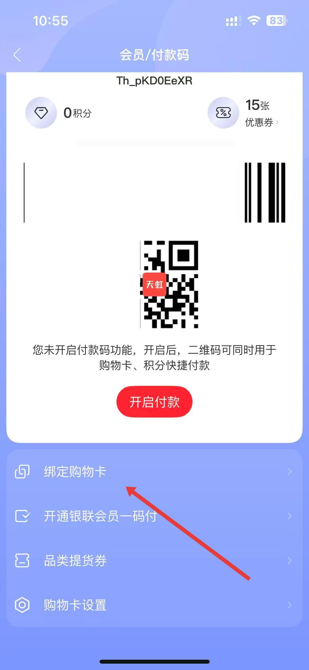 3、在会员付款码页面里,找到绑定购物卡选项,点击该选项,按照后续页面提示输入购物卡相关信息,即可完成购物卡绑定。