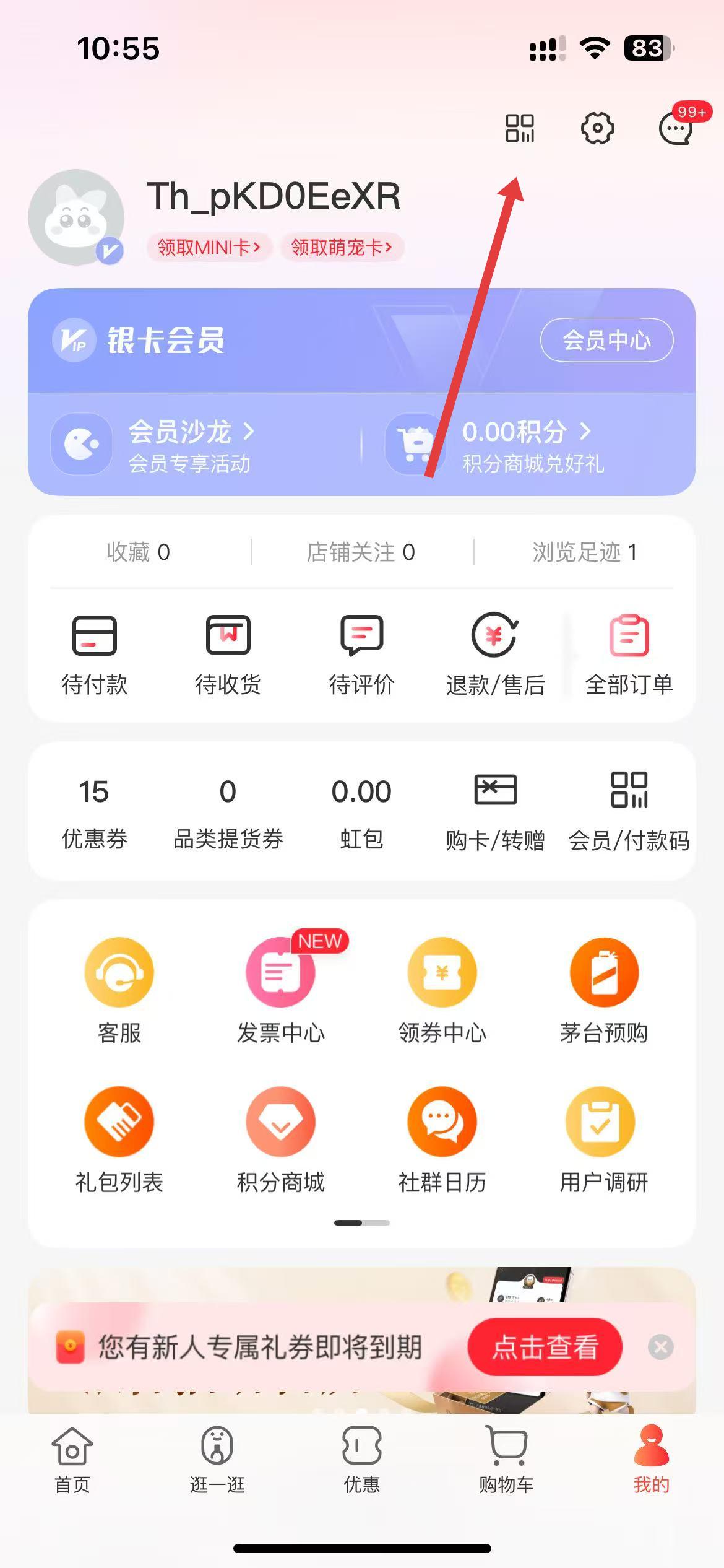 2、在个人界面中,找到并点击会员付款码选项,进入会员与付款码相关页面。