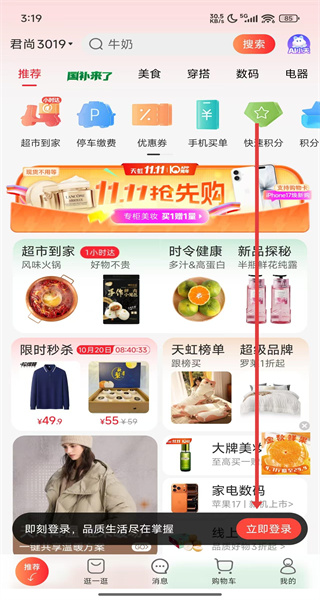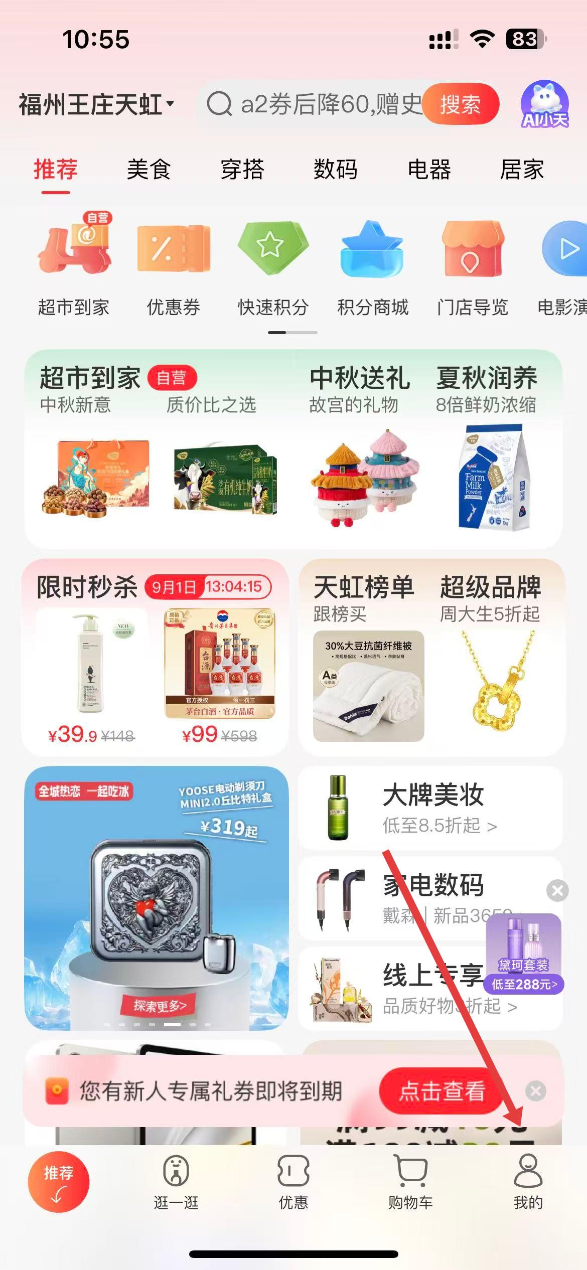 1、打开天虹超市app,进入首页后,点击底部导航栏最右侧的我的选项,进入个人界面。