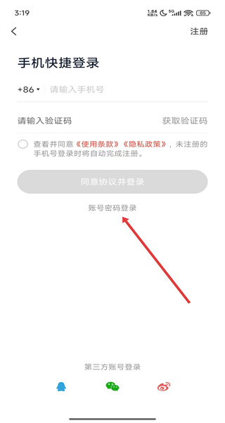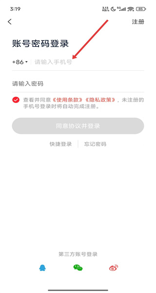 3、可点击输入款依次填写账号和密码后,勾选“查看并同意《使用条款》《隐私政策》”。
