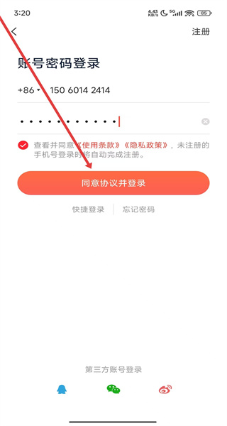 4、填写好登录信息后,点击同意协议并登录按钮,完成该APP的登录流程。