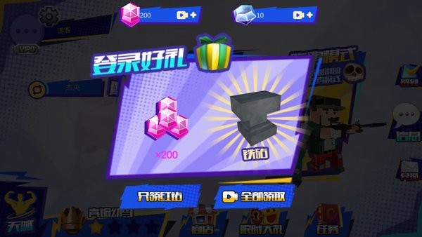 像素战争冲突战场带来超多趣味的挑战模式,玩家进入游戏之后可以自由选择躲猫猫竞技玩法或者是生存吃鸡模式,不同玩法将会带给你不一样的体验,其中的角色都是采用经典像素风格,看上去十分独特,每天还有大量任务礼包等你去领取哦!