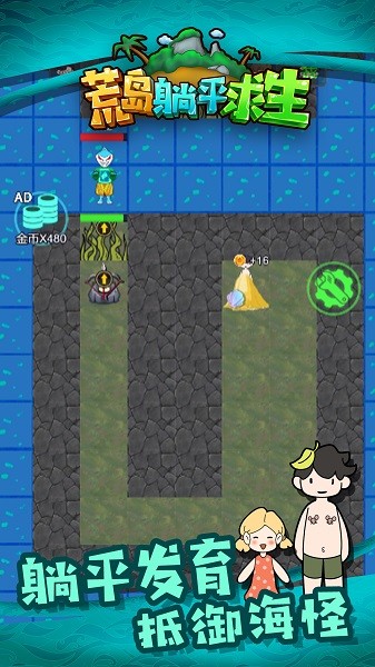 《荒岛躺平求生》是一款益智塔防闯关游戏。游戏中所有玩家不慎流落荒岛,进入每一个小房子里抵御海怪的侵袭,通过升级道具添加海上防御系统抵挡海怪的攻击,打败海怪,逃出罕见荒岛。同时,玩家可在游戏中体验“海怪”角色,攻击房间内的所有落难者,感受生存冒险的乐趣。互换身份的角色体验为玩家提供更有趣、刺激的游戏感受。