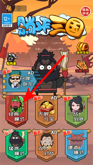 1、在躺平三国游戏主界面,点击经典模式选项,进入游戏模式选择页面。