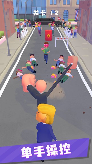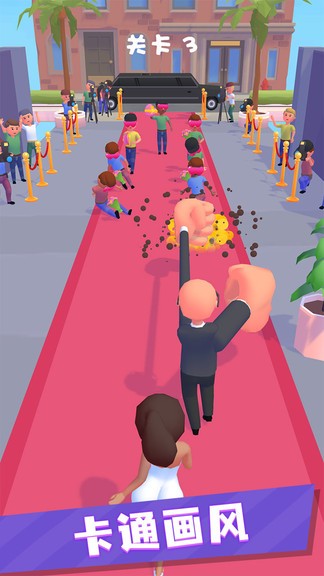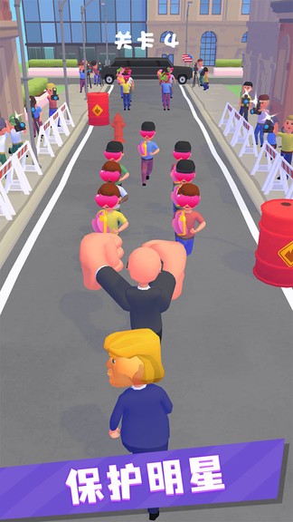 保镖救救我游戏手机版中你扮演一名保镖的角色,你的任务就是保护各路名人,在红毯上会出现很多狂热粉丝,你需要挥舞你长长的大拳头击退挡路的人,安全权护送名人行走到达目的地,欢迎感兴趣的朋友下载体验!