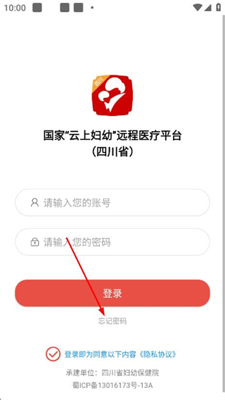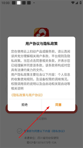 1、打开云上妇幼平台APP,在用户协议弹窗中点击同意,进入登录页面。