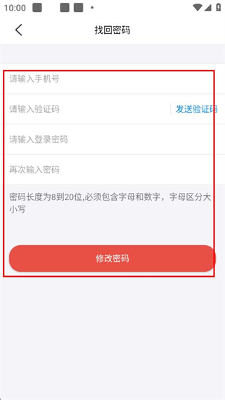 3、在找回密码界面填写手机号、获取并输入验证码,设置新密码后点击修改密码,完成密码找回。