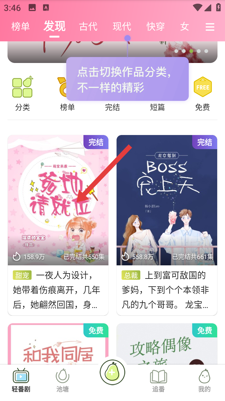 1、打开青梨阅读APP进入发现页面,点击感兴趣作品如萌宝来袭,爹地请就位进入阅读界面。