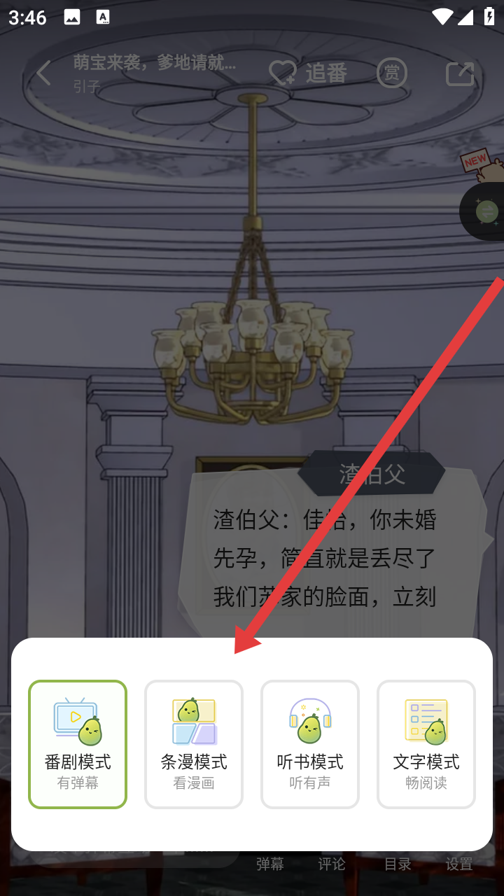 3、在弹出的模式选择窗口里,根据需求点击番剧模式、条漫模式、听书模式、文字模式任一选项完成切换。