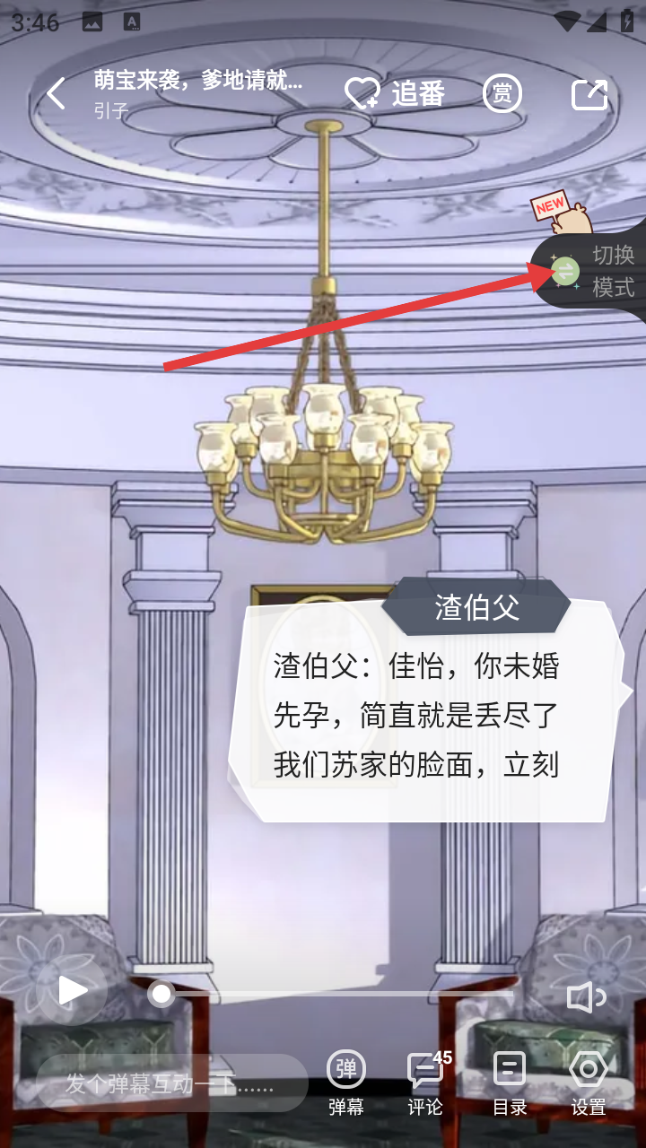 2、在作品萌宝来袭,爹地请就位的阅读界面中,点击右侧切换模式按钮唤起模式选择窗口。
