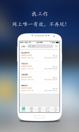 找工作这里的职位,效报名后,就免费安排一个你专属的职位顾问,为你的工作服务到底, 下班了聊,同厂交友,结识你心仪的小鲜肉和妹子,谈谈人生,聊聊理想常长途用免费电话吧,省钱没的说,外快不可少,方便自由的兼职,工作派是一款手机找工作软件,它能帮助你快速地找到合适的工作,让你找工作不在麻烦。