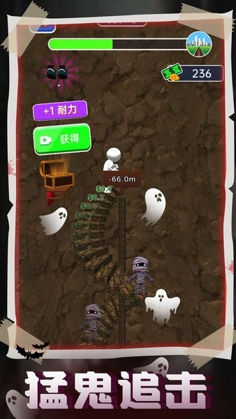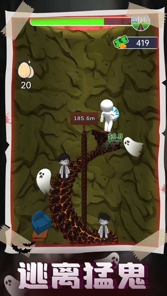 灵魂之塔是暗黑风休闲小游戏。在游戏中你不幸的被猛鬼抓到的了地下深处,而你要做的就是逃离猛鬼的追捕回到家中。点击屏幕搭建楼梯不断向上攀爬,注意你的体力消耗,在攀爬中会不断的消耗你的体力,而你要注意的就是不要让人物因为太过劳累导致游戏失败。