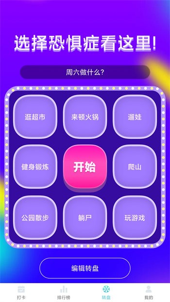 - 选择恐惧症必备的打卡器,不知道周六做什么?这里帮你选择,不管是逛超市、健身锻炼还是想干嘛都可以通过转盘编辑选择。