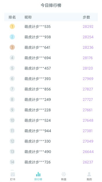- 挑战每日运动步数排行榜,在当日步数排行中榜上有名,运动并计步完成每日统计挑战。