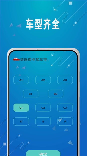 车型齐全,选择准驾车型,包含A1、A2、A3、B1、B2、C1、C2、C3、D、E、F等。