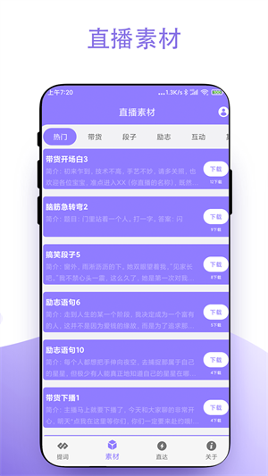 3、直播过程中进行悬浮提词、一键下载直播文案素材、一键打开短视频APP界面、一键打开直播。