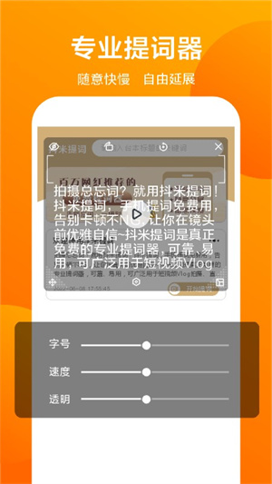 - 自由调整悬浮窗提词器的播放速度、字号、透明度等,更好的在手机上显示,让使用更加便捷;