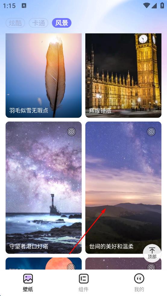 1、打开壁纸软件,在顶部分类栏中找到感兴趣的壁纸分类,点击该分类,进入风景类壁纸展示页面。