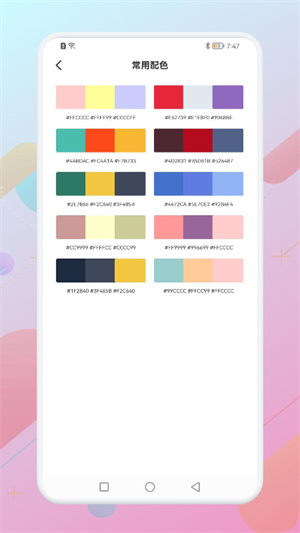 非常优质的配色软件,超多类型的配色提供给大家选择使用,让每个小伙伴可以尽情选择使用,随时选择喜欢的配色来使用,多种配色寻找配色灵感,轻松搭配出好色彩,让大家尽情选择配色来使用,唤醒你的配色记忆,掌握更多配色技巧。