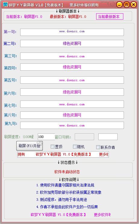 碎梦YY刷屏器是一款在YY语音过程中进行刷屏、霸屏的工具。软件使用简单,用户只要设置好刷屏内容和速度即可,软件就会帮你不断刷屏,感觉像整个的歪歪屏幕是被你承包的。有需要的朋友,赶快下载体验吧!