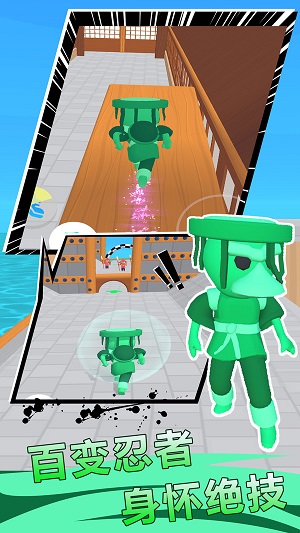 在游戏中,你将操纵忍者进行闯关,在关卡中,你需要合理运用技能,进行躲避,攻击,快速达到终点。