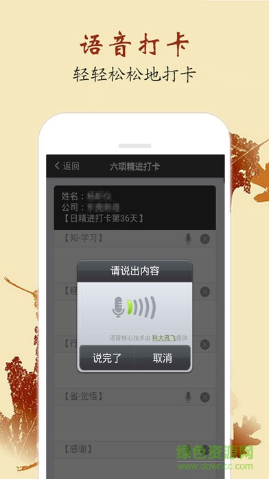 1. 不用手写,直接跟手机“说说话”,即完成打卡和在多个圈发布