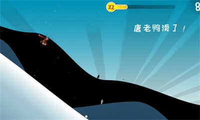 - 指轻触屏幕操纵人物,简单有趣,在惊险刺激的大冒险中体验爽快的滑雪感受。