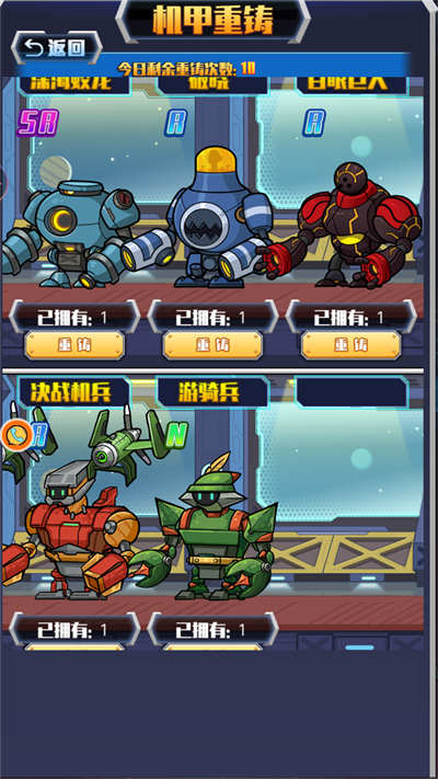 2、选择你的机甲上场,对不满意的机甲可以重铸或者出售;