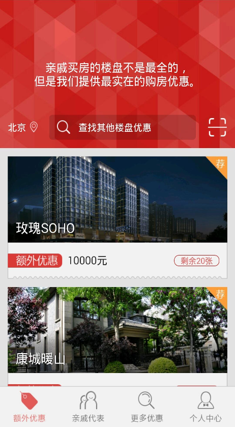 亲戚买房是给买房者提供额外优惠的。是一个全新O2O模式,亲戚买房,是第一个在移动互联网上实现了闭环的,地产营销o2o模式。是一个拥有全面的楼盘信息,让购房者能快速找到目标楼盘的买房平台。只要你想要额外优惠,就上【亲戚买房】看看,会给你最大的帮助。