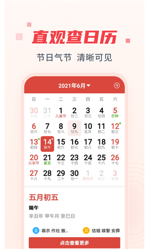 - 在线直观查看日历,节气、节日、公历、农历、宜忌等信息全都有,随时打开日历来查询。