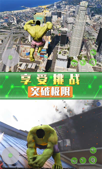 超凡巨人英雄游戏将会带来非常强大的绿巨人角色可以使用,拥有强大的破坏能力,玩家可以在城市中随意的进行破坏,将会带来更加轻松的游戏挑战,整个城市中都可以进行破坏,没有任何的限制,带来解压的游戏体验玩法。