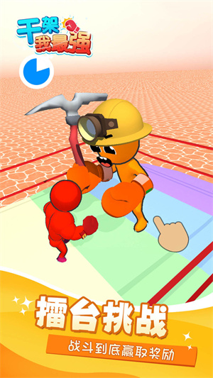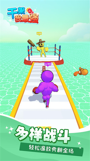 干架我最强是一款休闲跑酷的闯关游戏,需要玩家在前进的道路上收集更多的拳头去增强自己的实力,收集钻石来解锁更多的内容和玩法,注意敌人的等级,将比自己弱的敌人全部击败来强大自己,去击打最后的boss来获得奖励。