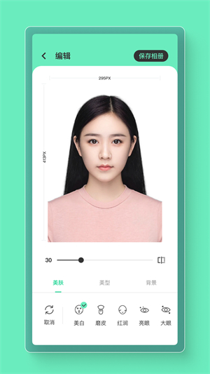 3、【超自然美颜美妆】在保证证件照不失真的情况下,可以手动对照片人像进行磨皮、美白、瘦脸、美瞳、大眼;