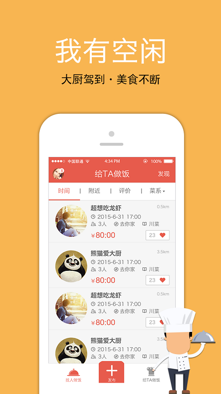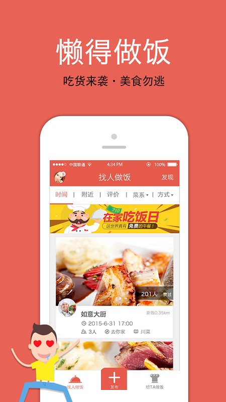 用户只要注册“在家吃”App,就可以线上发布订单预约中意的厨师做饭,可根据个人口味选择自己钟爱的菜系或者自定义菜单。同时,为了更贴近用户的实际需求,“在家吃”平台还提供了 “去你家做饭”、“来我家吃饭”、“我做好你来取”、“我做好送过去”等多样化的就餐模式 和“线上交友”的平台,食客既可亲眼见证厨师烹饪美食的美妙过程,体验别具一格的美味生活,还可以结交各路吃友,畅谈天下美食 ,享受无限乐趣。