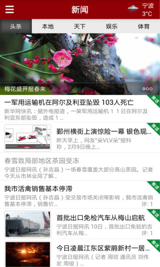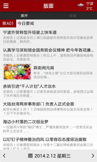 宁波日报官方应用即时发布《宁波日报》采集的各类资讯,并有微 博、天气、评论、分享、检索等多种功能,是您进入移动互联时代的独特助手。