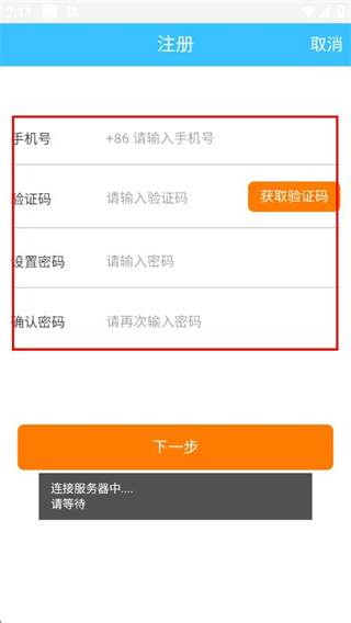 2、填写手机号、获取并输入验证码、设置并确认密码,点击下一步。