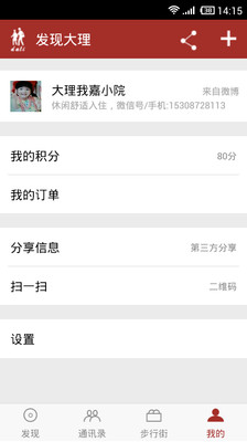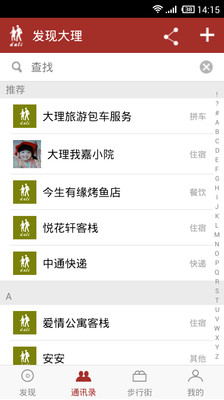 通讯录:精选特色住宿餐饮等商家,让你轻松掌控大理;查看通讯录可以拨打电话或发送短信给商家;