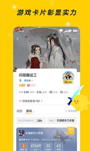 - 在线绑定你的游戏账号,在你的个人主页显示你的游戏卡片,彰显自己的实力,更快找到游戏同好;