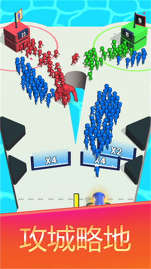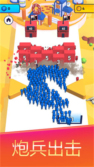玩家在游戏中控制炮台移动并发射炮弹兵,经过倍率门后壮大部队人数,击败敌人夺取大本营。