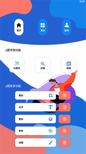 - 汇聚多样功能服务给大家来尝试,每个P图功能都是专业的服务,大家可以自由选择来P图修图;