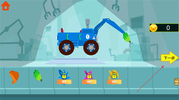 1、在初始界面可选择挖掘机的不同零件,点击下一步进入游戏场景,开启驾驶挖掘机的冒险。