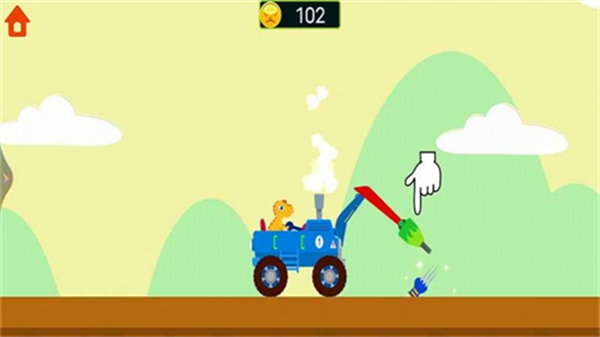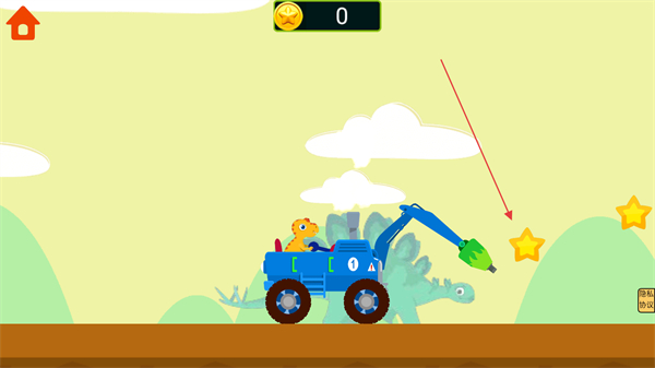 2、驾驶挖掘机在场景中移动,收集星星等资源,通过操作挖掘机的挖掘臂来获取,积累资源可用于解锁新零件或功能。