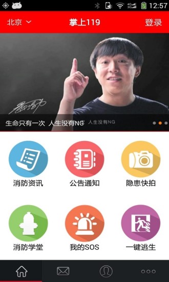重庆掌上119”手机客户端目前共有:消防资讯、消防学堂、公告通知、隐患快拍、一键逃生、我的SOS六个功能板块。