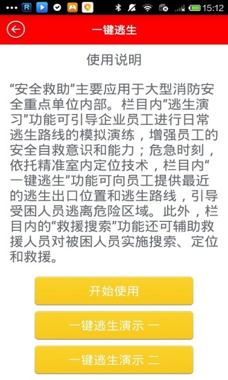 “一键逃生”板块是采用iBeacon定位技术,它可以向室内被困人员提供逃生路线的导航辅助。