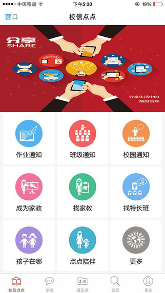 校信点点是一款应用于学校、教师、家长及学生多方间的沟通软件。不受时间空间因素让家长和老师实时沟通,方便了解学生的学校表现。校信点点也能构筑爱心GPS定位,非常好的让家长了解学生位置,安全有保障。内置的一系列功能更好的为教育服务,为安全服务。校信点点目前包括作业通知、班级通知、学校通知、成为家教、找家教、找特长班、孩子在哪、点点陪伴、更多,九大应用板块。支持添加点点好友,沟通互联;发布点点圈;配合GPS手表定位监控孩子安全等功能。